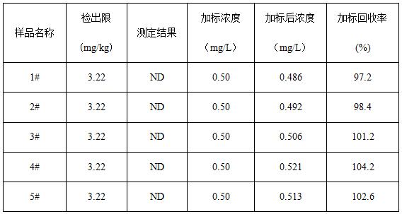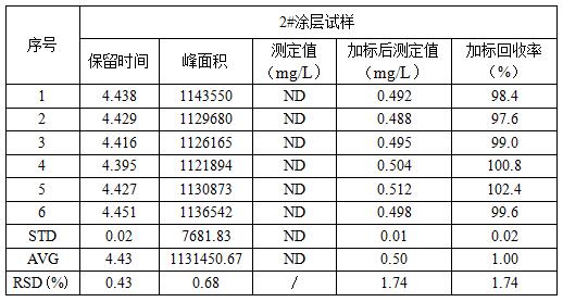 随机抽取2#涂层试样停止加标0.5mg/L反复测定6次,考查了保留时候、峰面积的反复性及加标收受接管率,此中保留时候的反复性(RSD)为0.43%,峰面积的反复性(RSD)为0.68%,加标收受接管率的反复性(RSD)为1.74%,测试成果详见表3所示。