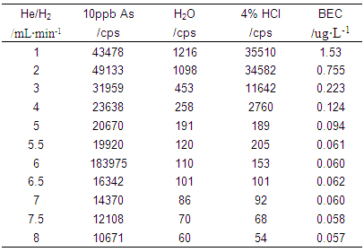 仪器起首在规范形式下停止参数优化(操纵10μg·L-1的Li、Co、In、U、Ce调谐液对仪器任务参数停止调理,使仪器活络度高,同时氧化物及双电荷产率小于3%);再♏开启He/H2碰撞反映气,慢慢增大He/H2流量,测试超纯水、4%HCl及10μg·L-1 As(4%HCl介质)在75amu处的呼应旌旗灯号ಞ,计较其背景等效浓度(具体数据见表1及图1);并操纵As标液进一步优化He/H2流量,获得仪器任务参数如表2所示。